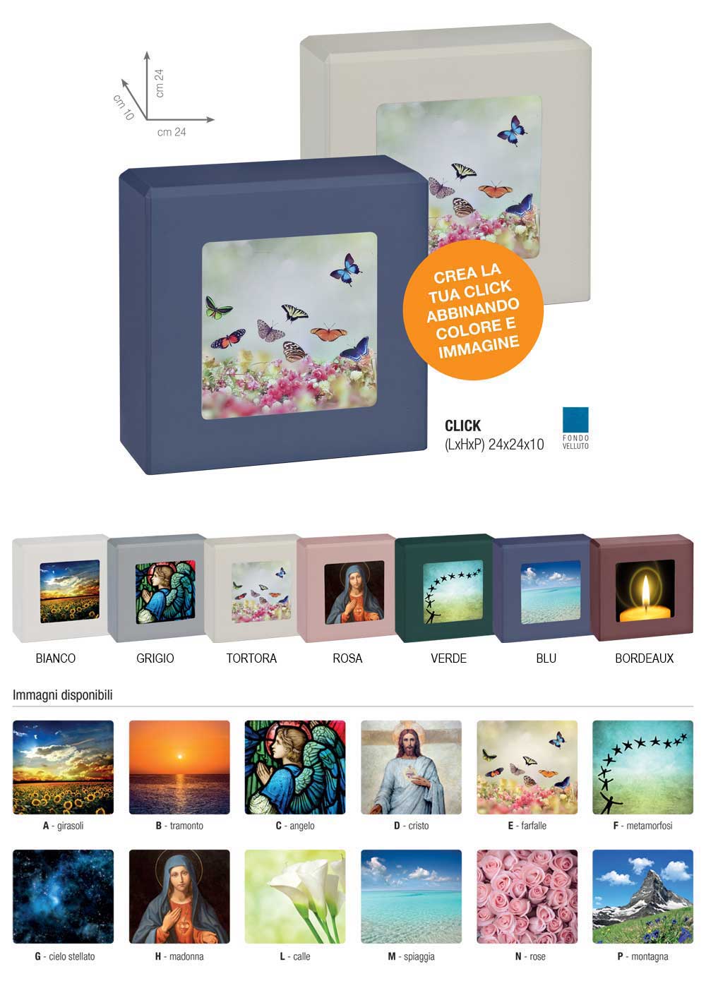 La collezione CLICK, viene realizzata in 7 colori pastello con applicazione di un’immagine (a scelta tra 12 soggetti) sulla parte anteriore dell’urna.